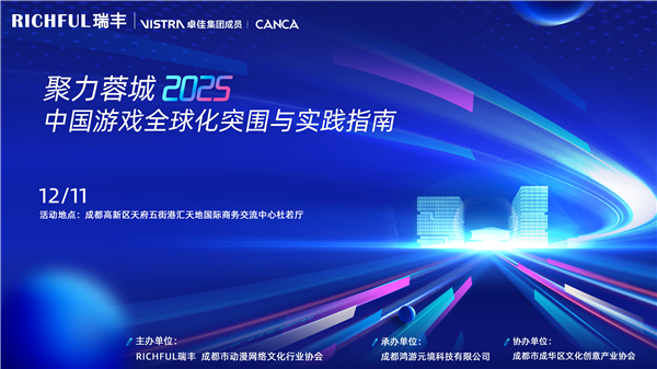2025 年 12 月 11 日下午,“聚力蓉城 2025—— 中國游戲全球化突圍與實踐指南” 活動在成都高新區天府五街港匯天地國際商務交流中心杜若廳盛大舉行。本次活動由 RICHFUL 瑞豐與成都動漫網絡文化行業協會聯合主辦,旨在助力游戲企業在全球化浪潮下,快速且穩健地拓展海外市場,有效應對政策、合規及市場等多方面挑戰。